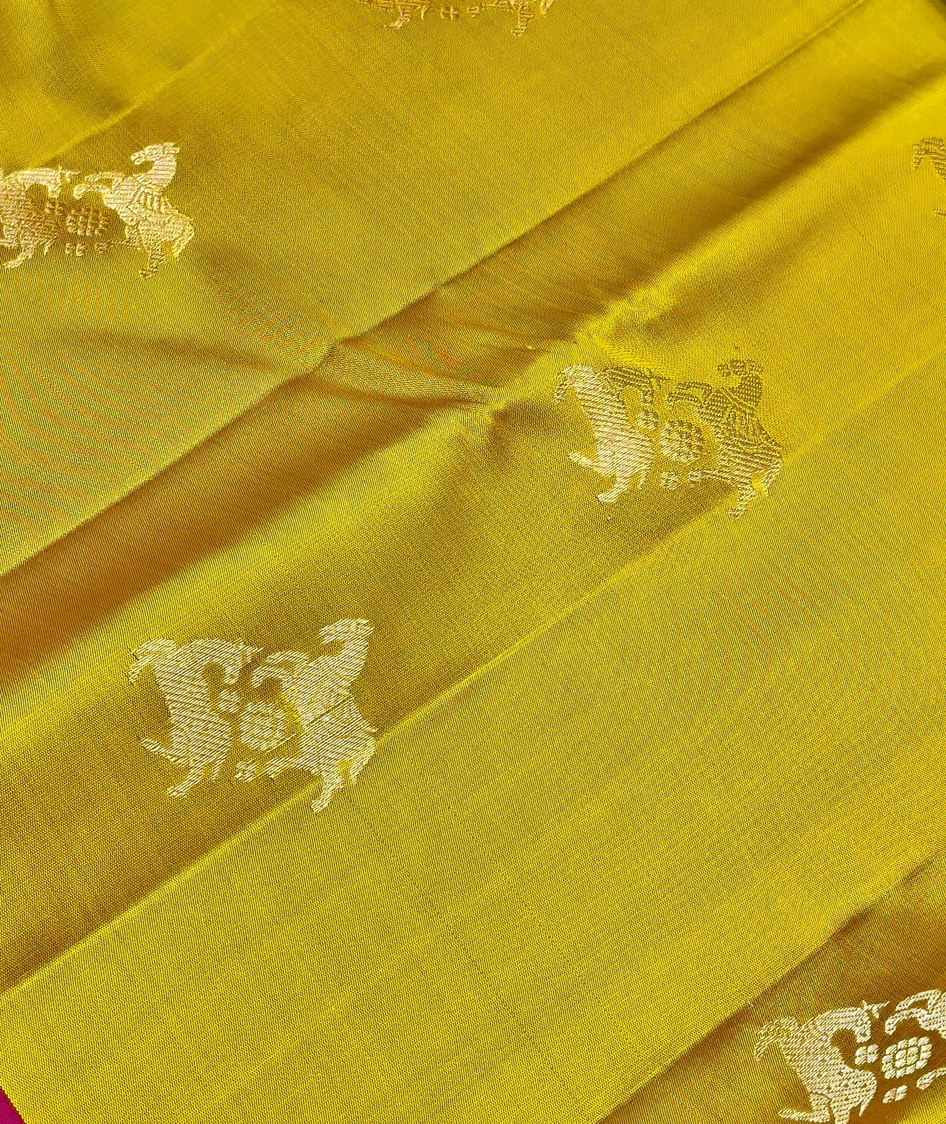 A radiant sunshine-yellow soft silk saree highlighted with a rich maroon border – perfect for festive occasions and weddings. Its lustrous drape combines elegance and tradition, making every moment feel special.